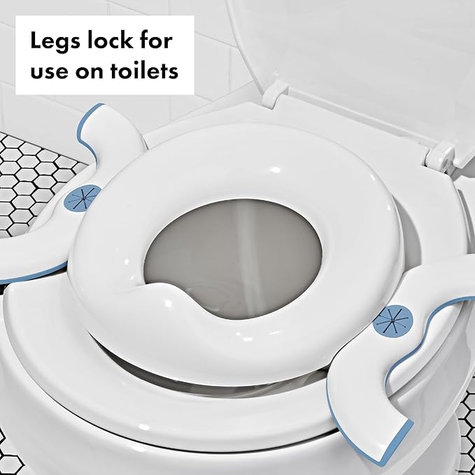 - Can be used flat on toilets; legs lock open for use as a standalone potty
