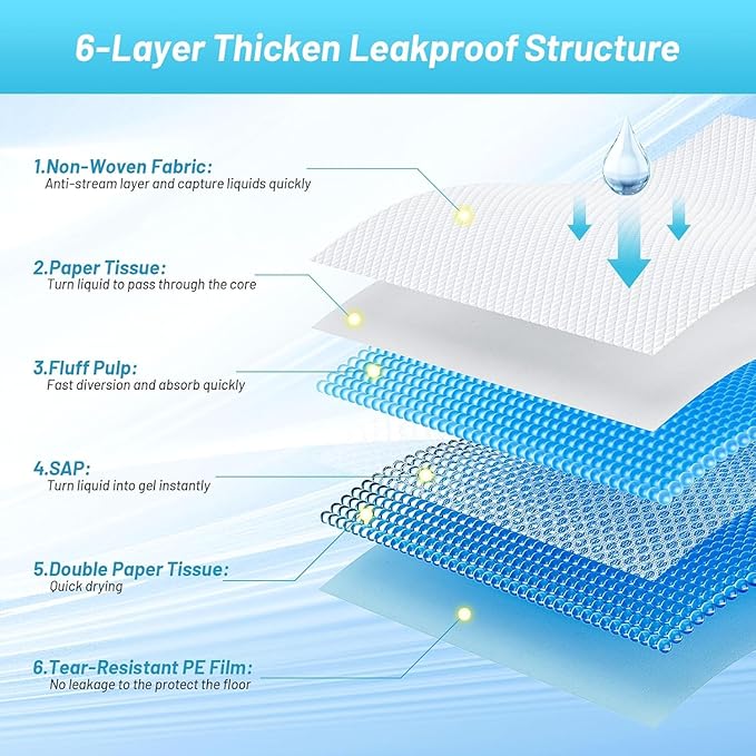 - Ultra Absorbent & Quick Drying: The 6-layer protection design makes our dog pee pads thicker & more absorbent than other dog training pads, perforated film as the top layer of the doggy pads which can speed up the liquid to pass through the surface than common non-woven fabric and keep the surface quick-drying