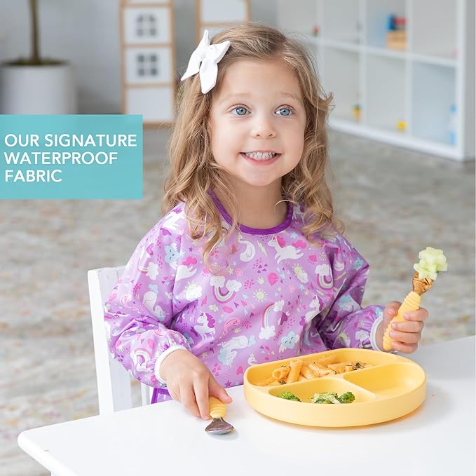 Bumkins Sleeved Bib for Girl or Boy, Baby and Toddler for 6-24 Mos Essential Must Have for Eating, Feeding, Baby-Led Weaning Supplies, Long Sleeve Mess Saving Food Catcher, Soft Fabric, Unicorn Purple