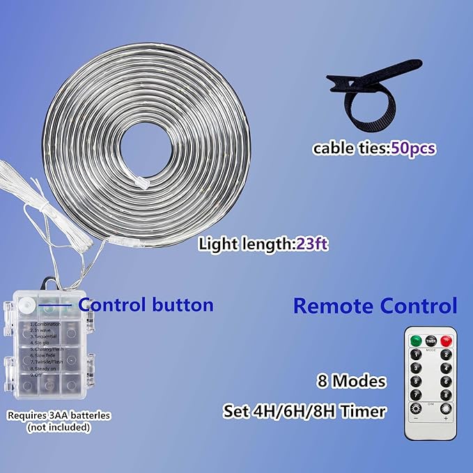 - 23 Ft Stroller Lights: The package includes a 23 ft multicolor baby stroller lights with 50 cable ties, a remote control for remote switches and modes, a waterproof battery box that requires 3 AA batteries (NOT included) to power it.