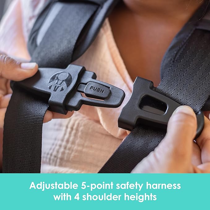 - 5-point adjustable safety harness with padded shoulders and crotch covers and 3 harness height positions with comfortable arm rests