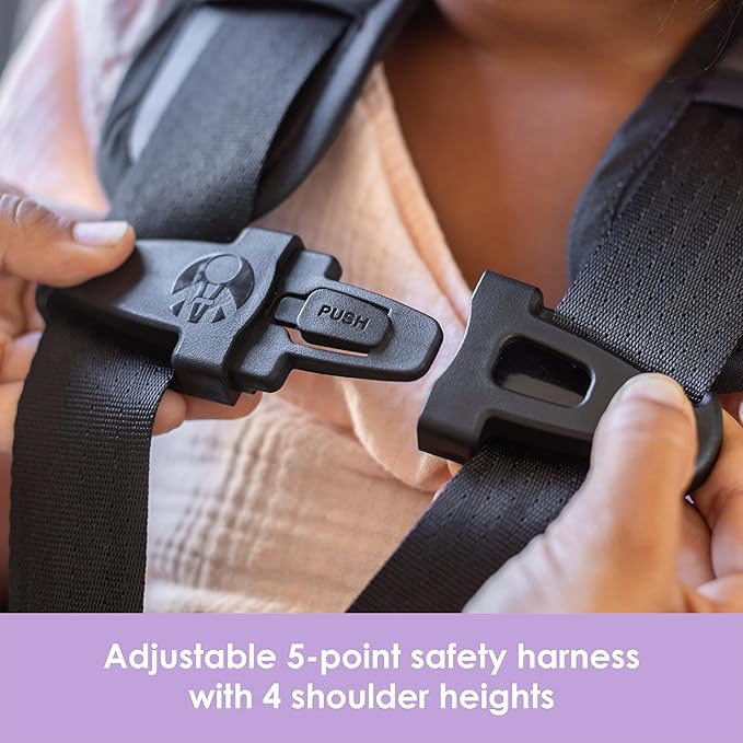 - 5-point adjustable safety harness with padded shoulders and crotch covers and 3 harness height positions with comfortable arm rests