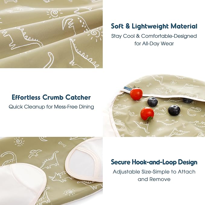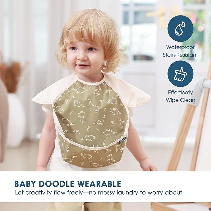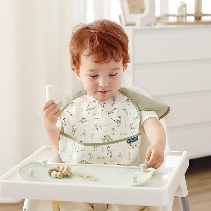- ADORABLE AND FUNCTIONAL DESIGN: GRSSDER mess-proof bibs set include 3 different original adorable patterns, making your little ones more cuter and cheerful when feeding. Designed for comfort and convenience, our waterproof bibs keep your little one's clothes clean during mealtimes, playtimes and messy adventures. The deep catch-all pocket make it easy to grab every crumb, splash, and paint drip.