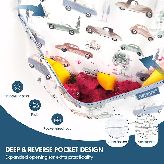 - ADORABLE AND FUNCTIONAL DESIGN: GRSSDER mess-proof bibs set include 3 different original adorable patterns, making your little ones more cuter and cheerful when feeding. Designed for comfort and convenience, our waterproof bibs keep your little one's clothes clean during mealtimes, playtimes and messy adventures. The deep catch-all pocket make it easy to grab every crumb, splash, and paint drip.