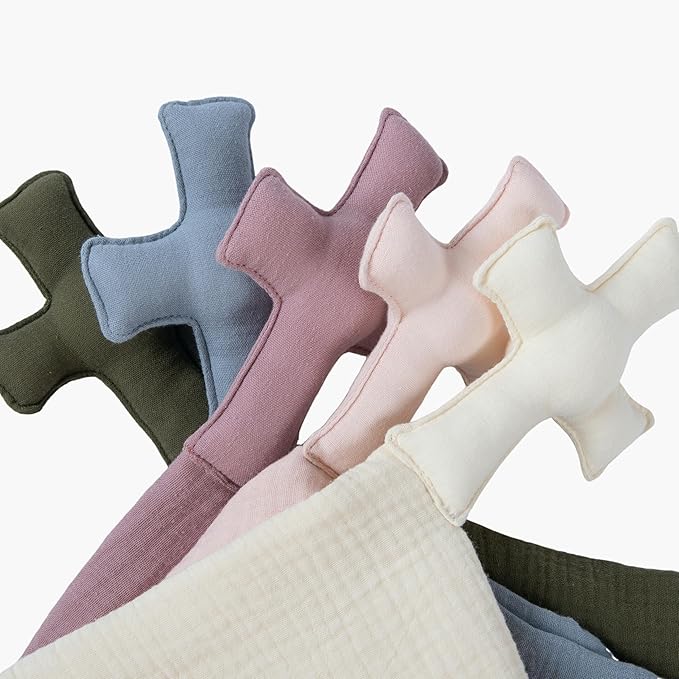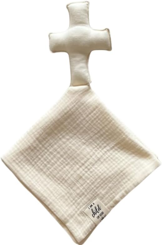 - Faith Filled Lovey: this adorable lovey offers baby comfort and joy, and is a beautiful reminder of God’s great love. Unique design: cross is easily squeezed by baby’s little hands, providing a soothing and comforting effect. Child of God tag with affirmations on the back, showing just how loved sweet baby is! Soft & Comfy: durably made with a double layer of 100% organic cotton muslin, gentle on baby’s skin. Polyester fill in the cross. Great gift: this blessing blanket is the perfect gift for any Baptism, baby shower, newborn gift, or Easter day! Blankie measures 16” x 16”, Cross measures about 5.5” tall. Parent supervision is always necessary with little ones.