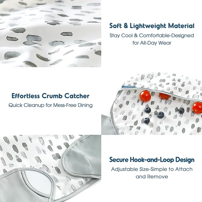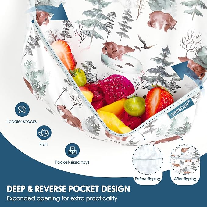 - ADORABLE AND FUNCTIONAL DESIGN: GRSSDER mess-proof bibs set include 3 different original adorable patterns, making your little ones more cuter and cheerful when feeding. Designed for comfort and convenience, our waterproof bibs keep your little one's clothes clean during mealtimes, playtimes and messy adventures. The deep catch-all pocket make it easy to grab every crumb, splash, and paint drip.