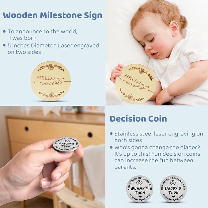 - Gifts for New Mom and Dad: Carefully selected gifts for parents are all packed in a beautiful gift box, including 1 set of Mom and Dad glass cups, 1 cute unisex cotton bib, 1 unisex onesie for 0-3 months, 1 baby ultrasound picture frame, 1 pair of creative socks, 1 decision coin, 1 wooden milestone sign and 1 greeting card, each gift is carefully selected as love and encouragement for soon-to-be dad and mom