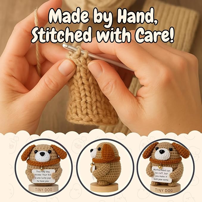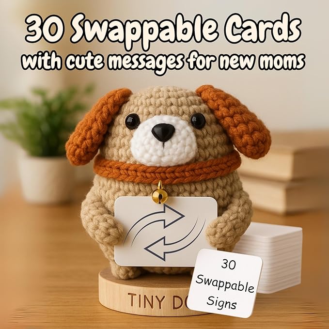 - Adorable Handmade-Style Crochet Dog - This tiny, high-quality crochet puppy comes with a wooden stand and changeable mini signs. Moms can display their favorite message anywhere - on their desk, dresser, or nursery shelf - for instant smiles