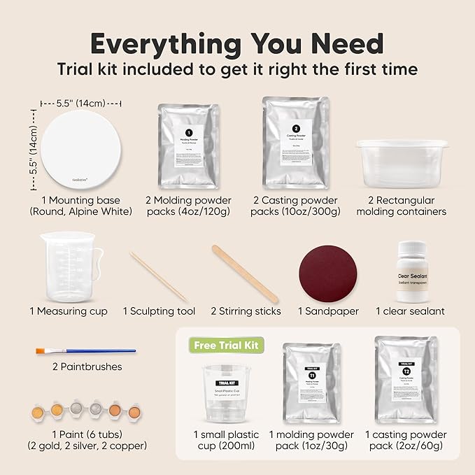 - All-in-1 – Our baby molding kit has all you need to personalized 2 castings. Includes a trial kit, 2 molding & casting powder pack, display base, sealant, 2 molding containers, stirring sticks, colored paint, brushes, sculpting tool, and sandpaper.