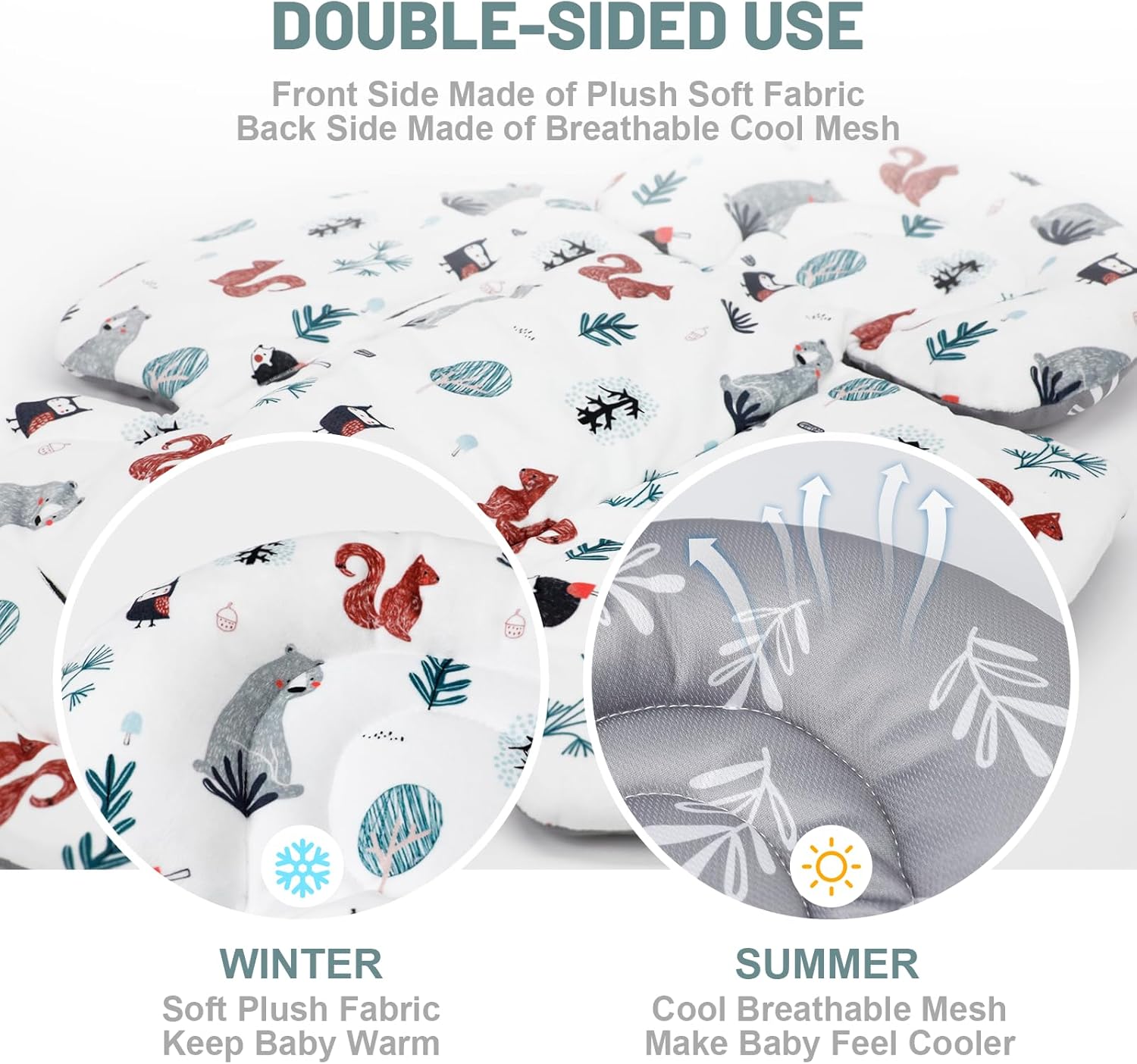 - Revesible for All Seasons: One side of the newborn insert is made of soft plush velvet fabric keep babies warmer in winter, and the back side is made of cool breathable mesh that makes babies feel cooler in summer, both sides printed with different adorable patterns ,make your little one comfortable in no matter summer or winter
