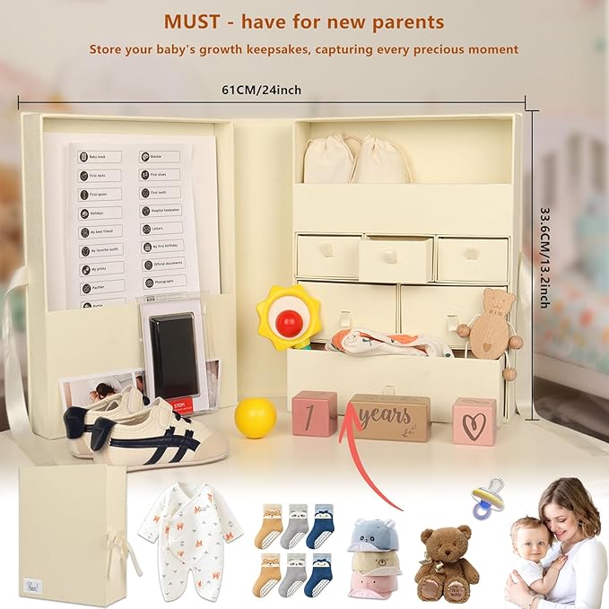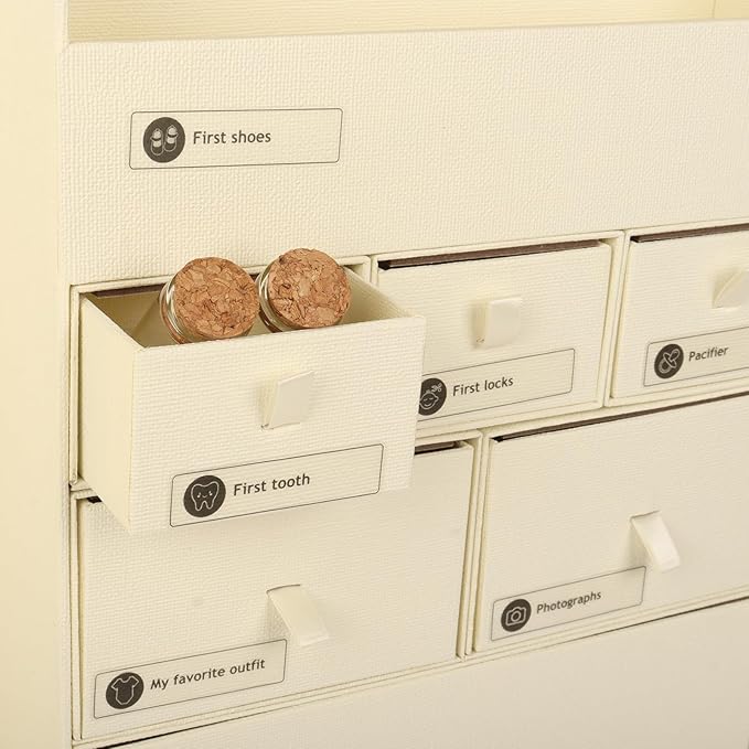 - Customizable And Spacious Storage:baby box keepsake drawers vary in size, whether it's a photo of your baby, baby shoes, hospital wristbands, or hair and hats, this keepsake box meets your needs, and it preserves those precious first moments, allowing you and your family to relive them for years to come.