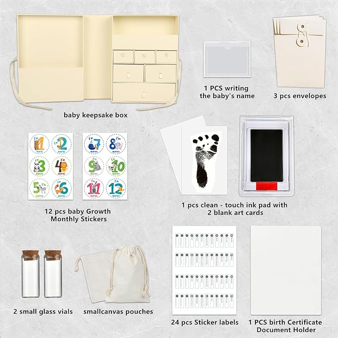 - Baby Keepsake Box Set: the baby memory box includes a stamp pad, canvas bag, envelopes, small glass vials, folders, labels, and a set of 12 adorable baby milestone stickers. these stickers work as props for baby photo shoots to document growth—all designed to help you organize and create keepsakes quickly and effortlessly.