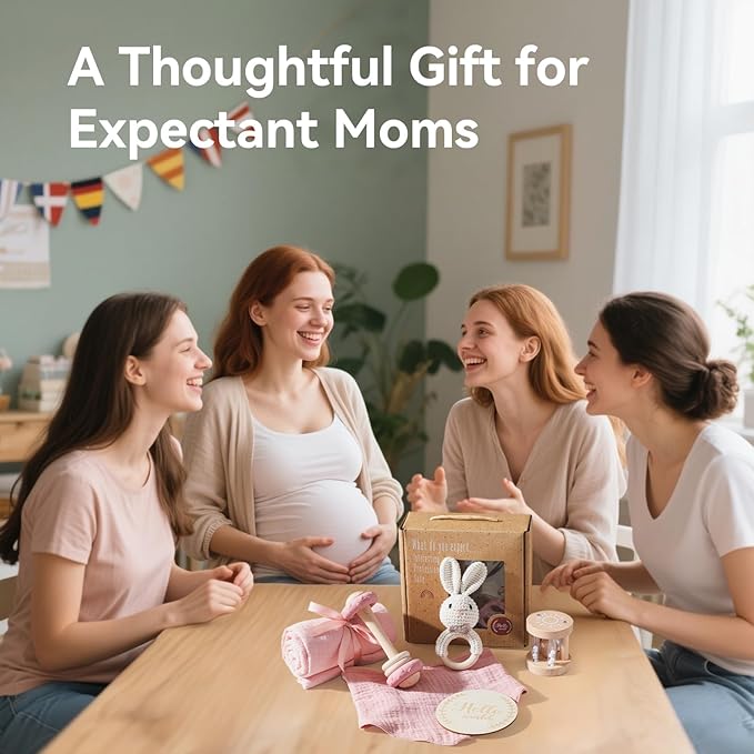 - Exquisite Set Configuration: The baby shower gift contains a soft pink towel, a pink drool bib, an adorable bunny rattle, a wooden rattle musical instrument, a pink silicone dumbbell, and a round commemorative plaque with an exquisite pattern, meeting the daily and play needs of babies