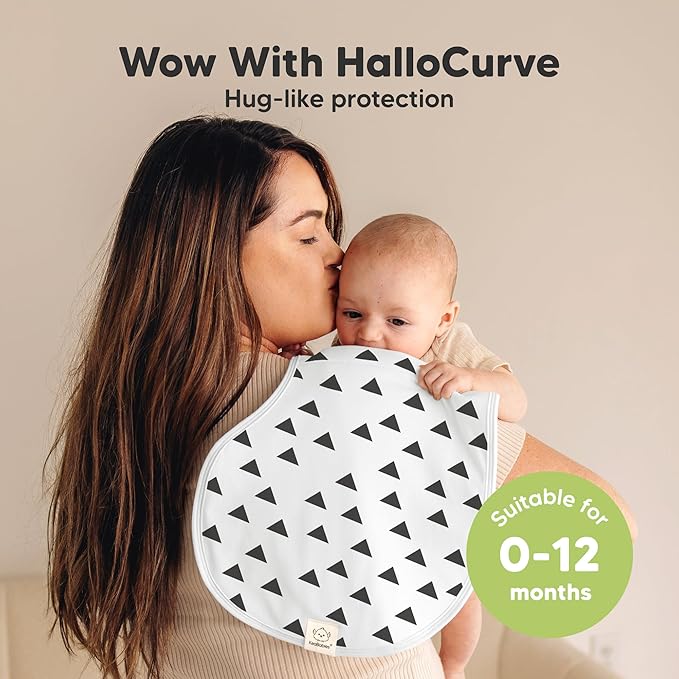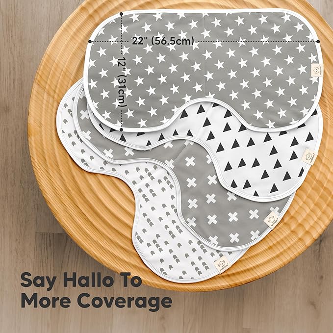 - Hallo to More Coverage - Our organic baby burp cloths for girls and boys, sized at 22" x 12", are extra large and wide to fully cover your shoulders. The unique Hallo Curve provides more coverage & comfort, perfect for spit ups and feeding mishaps.