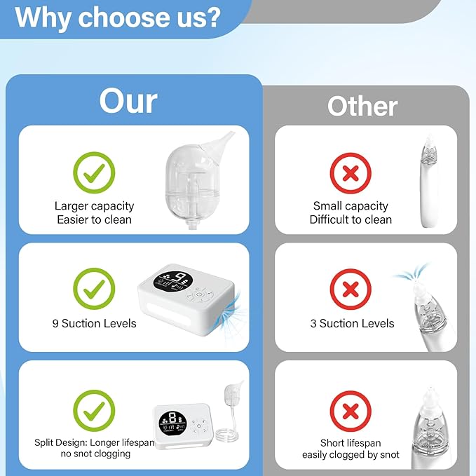 - Powerful Yet Gentle Relief: The nasal aspirator for baby boasts 9 customizable suction levels for quick and gentle congestion relief. Experience the ease and effectiveness of clearing your little one's nasal passages, ensuring smooth breathing and a restful night's sleep for your precious baby.