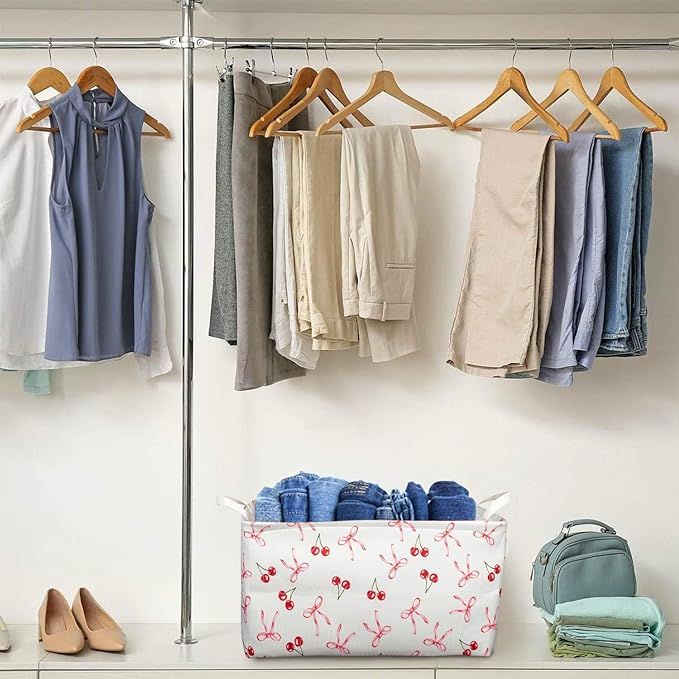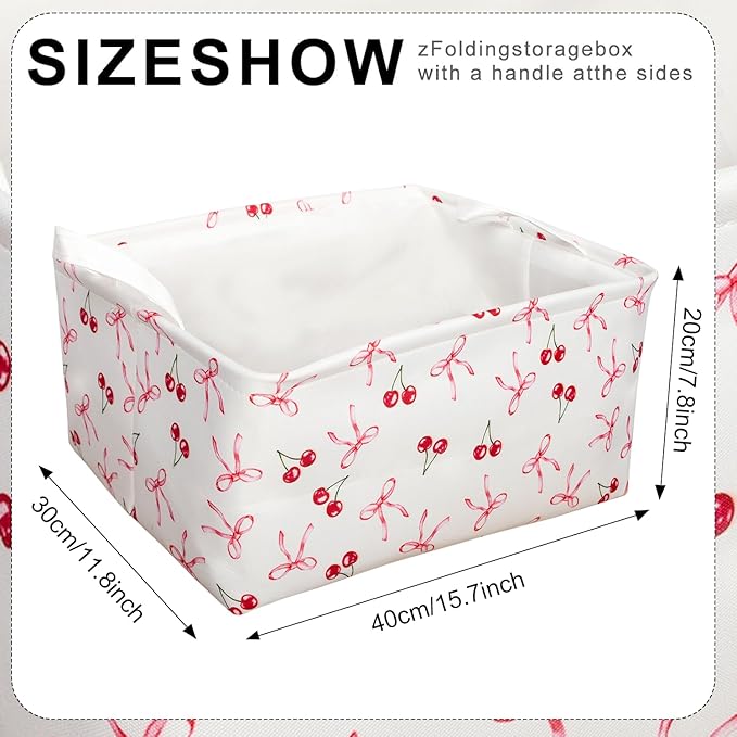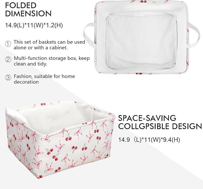 3 Pcs Pink Bow Storage Basket, Coquette Girls Rectangle Storage Bins Box with Handles, Bows and Chery Shelf Basket Ideal for Room Nursery Decor, Books, Organizing Clothes, Toys