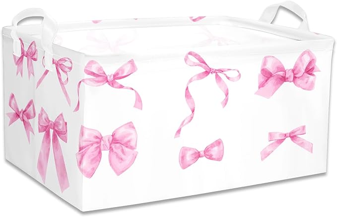 - 【VERSATILE 3-PACK SET】 Each medium-sized pink bow basket measures 13.7×9.8×6.6 inches (40×30×20cm), offering ample storage for baby items, clothes, toys, linens, and more. Sold as a 3-piece set, these bow printed bins effortlessly organize multiple rooms while showcasing unique Coquette Bow-themed prints on each pink basket.