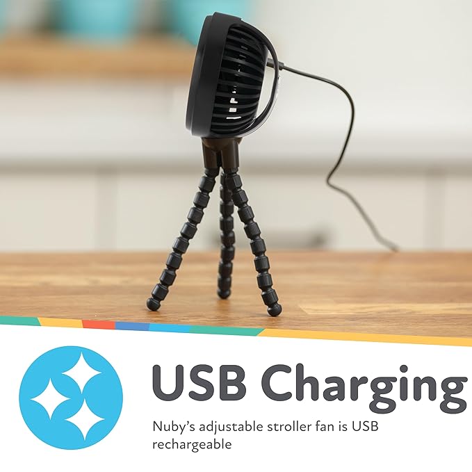 - ADJUSTABLE TRIPOD STROLLER FAN FOR BABIES: Nuby's Stroller Fan is a three-speed portable fan with adjustable tripod legs and rechargeable USB, perfect for indoor or outdoor use