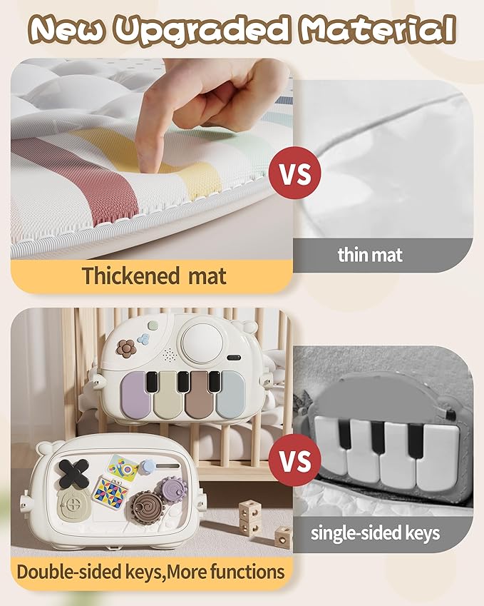 - Babies Activity Play Mat:With a variety of play modes to adapt baby's growing needs.A play mat for baby's playtime.Attracts baby's attention and provides various ways to play.Kick the piano, press the rattles,keeps baby entertained and busy.