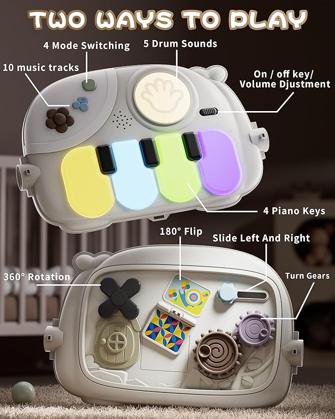 - Early Development Infant Toys:The multifunctional panel on the back with cross runner,switch button,finger buttons,etc.It is very useful for developing baby's fine motor skills and hand-eye coordination. music also help babies to start musical enlightenment.Great educational learning toys for babies 3-6 6-12 months.