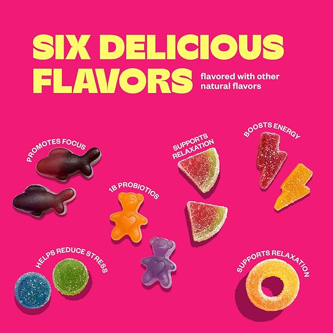 - TRY 'EM ALL: Try all six utterly irresistable flavors for whatever life is throwing your way. Our gummies are a next-level fix of flavor with wellness benefits that keep you vibing like Relaxation, Stress Relief, Focus and Energy.