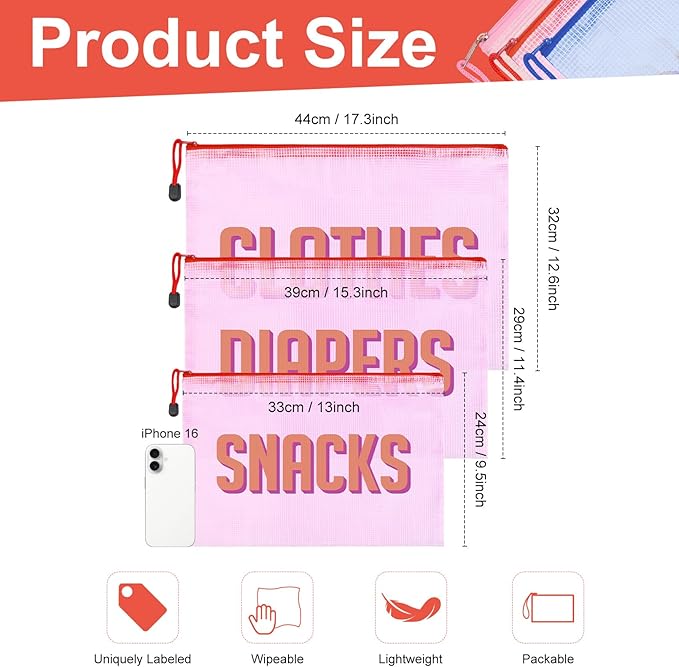 - Three Practical Sizes for Essential Needs - Includes three zipper bags in different sizes to accommodate your needs: Large (44x32cm / 17.3x12.6 inch) for clothing; Medium (39x29cm / 15.3x11.4 inch) for diapers;Small (33x24cm / 13x9.5 inch) for snacks or small items
