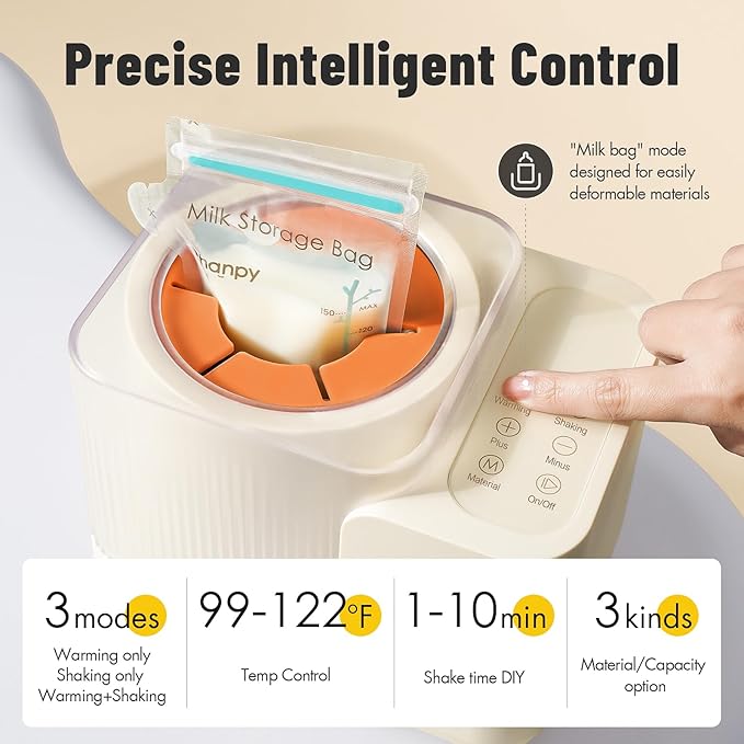 - 【Precise Intelligent Control】- Set exact temps (99-122°F) and shake time (1-10 mins), 3 kinds material/capacity option. Use warming-only, shaking-only, or both together – ideal for night feeds, thawing breast milk, or quick formula prep. Unique "Milk bag" mode designed for easily deformable materials.