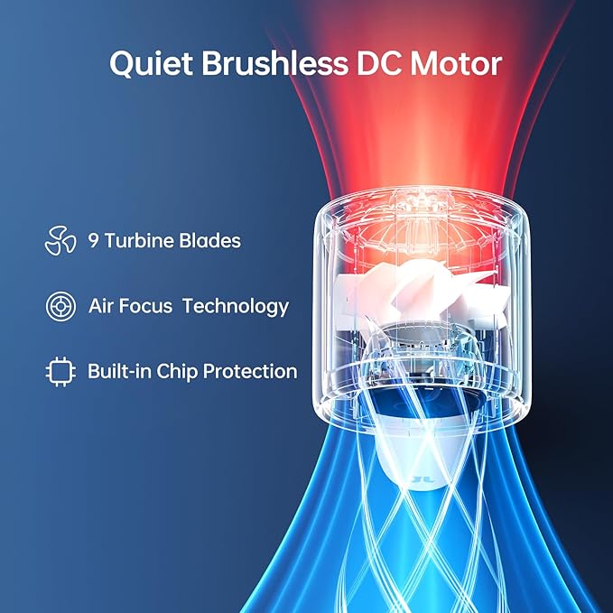 - 9 Blade Design - Ultra Quiet: With 9 ultra-quiet blades, this mini portable fan operates at a low noise level of 56-76 dB, ensuring a peaceful wind speed experience. And the aerodynamic blades deliver strong, stable airflow for optimal comfort