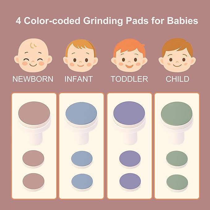 - Full Family Nail Care Kit – Fansidi infant nail file comes with 4 color-coded grinding pads for babies and 2 pads for adults, ranked neatly in the travel case. Additionally, 4 extra age-specific grinding heads + 8 soft sandpapers as a bonus are included in the color box, suitable for gentle filing from newborns to adults, saving future replacement costs.