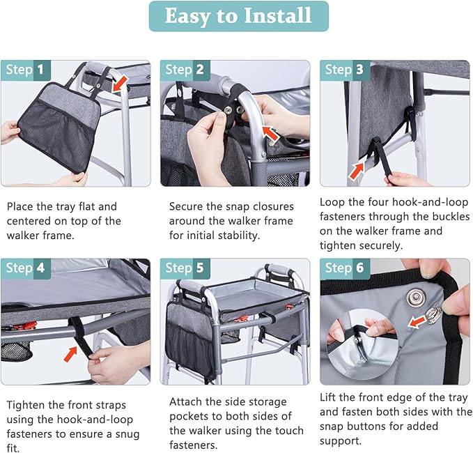 - 📏 Universal Fit & Spacious Design: Tray measures 16" x 13" x 3", with 10" deep side pockets. Compatible with most folding walkers, both with and without side bars (see size chart image). Transforms your walker into a stable, multi-use table for meals, reading, phones, or medications.