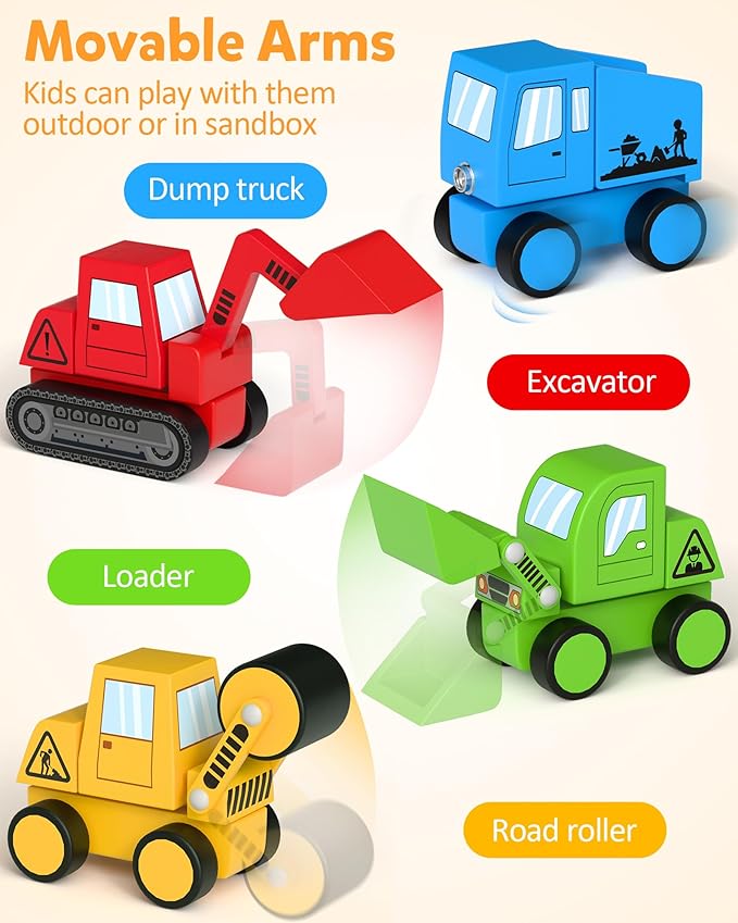 - Take Apart Vehicle Toys for Kids: This snap together wooden Vehicle toy set is great for young kids! It comes with 4 take apart construction wood trucks: excavator, loader, road roller, dump truck, and 2 mini-figures and 3 road signs, great truck building construction toy for kids ages 3-8, making play fun and educational