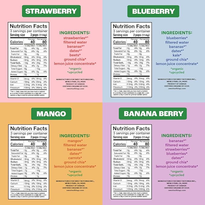 - REAL FRUIT AND VEGGIES: Sweet Nothings Squeezable Smoothies are only 40 calories per pop and made with real, organic fruits and veggies! Not juices, concentrates, or flavors but real, organic ingredients.