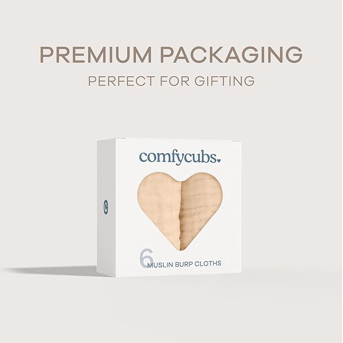 Comfy Cubs Muslin Burp Cloths 20" x 10", Pack of 6 - Large, 6-Layer, Ultra Absorbent 100% Cotton for Baby Drool and Messes - Soft, Safe & Gentle Baby Burp Cloths for Boys & Girls - Cream
