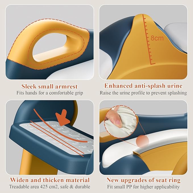 - Stable, Safe and Non-Slip: The four corners of the bottom of the toilet training seat for toddlers baby are non-slip to ensure safety and stability so that your child can use the potty step stool safely. Thickened material, more durable. Widened pedal area, convenient for toddlers to turn around and sit down, more assured to use