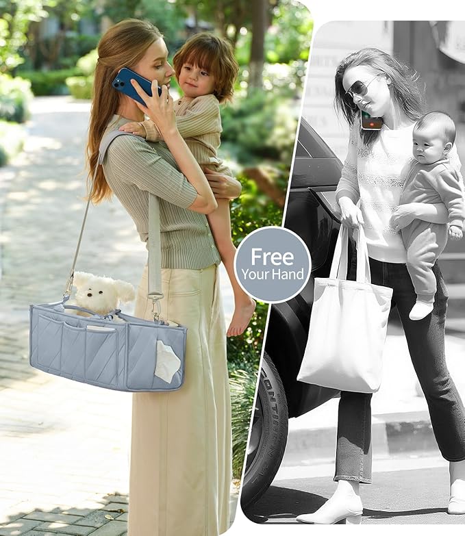 - VKSAO'S lightweight, quilted caddy orgnizer offers hands-free ease and comfortable to carry for baby essentials. The multifunctional accessories design fits everything from toys to spare outfits and extra wide tissue pocket makes it easy to find baby wipes in a pinch.