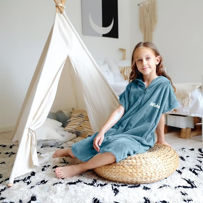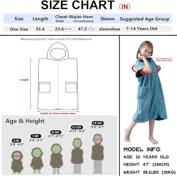 - ONE SIZE & UNISEX: This towel robe fits most boys and girls between 7-12 Years. 33.5"L x 23.5"W, 0.9 Pounds. It is not picky about kids’ body type and is easy to be pulled on.