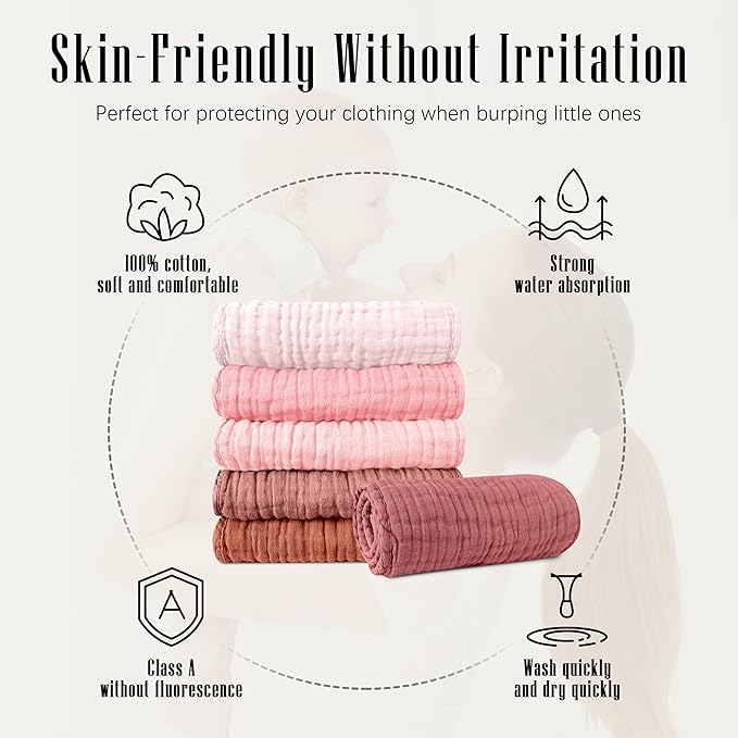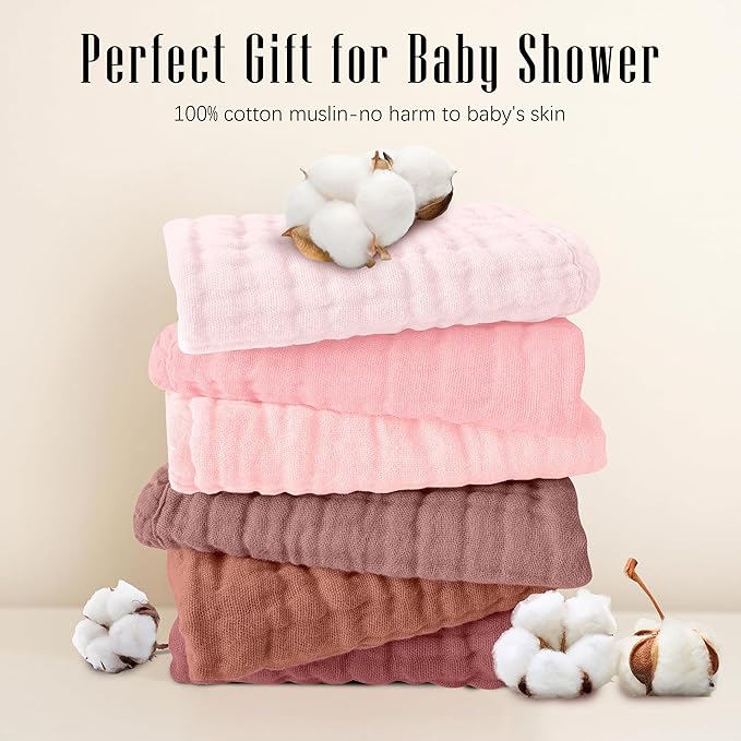 SWEET DOLPHIN 12 Pack Muslin Burp Cloths Large 100% Cotton Burping Clothes for Baby Drool - Absorbent and Soft Boys & Girls Milk Spit Up Rags for Newborn Essentials Registry - Dewy Petal