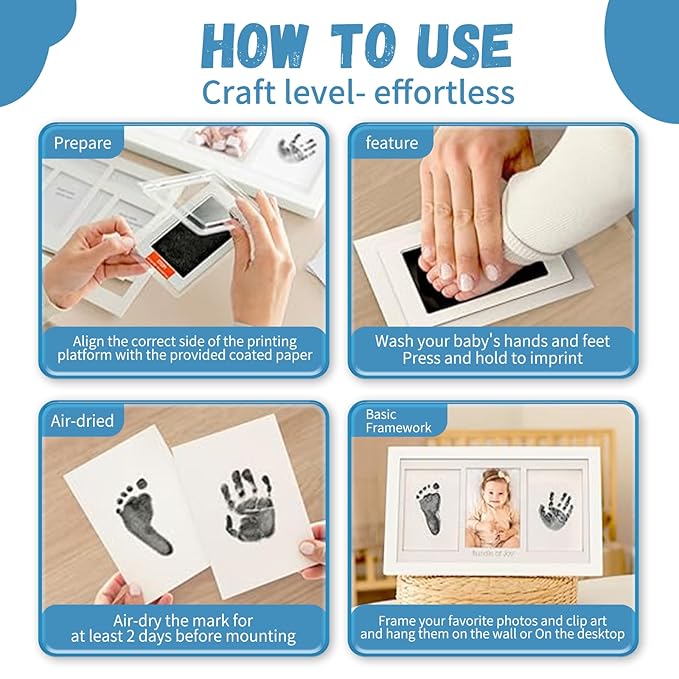 - No Mess, No Residue Our baby footprint kit and baby handprint kit are designed to create beautiful keepsakes without leaving any mess or ink residue on your baby. Featuring a clean touch ink pad with a “zero ink contact” imprinting method, it ensures safe and easy stamping for your baby handprint frame or baby footprint frame. Keep your baby's first prints without the mess!