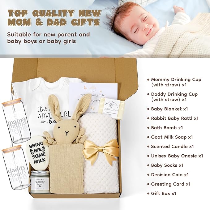 - 🤱🎀【TOP PREGNANCY GIFTS FOR NEW PARENTS 】-Still looking for a gift for a first time expecting mother and father?Make your gift unforgettable with our beautifully curated baby gift box set! Designed to stand out among the dazzling array of pregnancy gifts, this set includes everything a new baby and their parents need. Featuring baby rabbit plush, mom and dad drinking cups, baby socks, baby mittens, comfort blanket, and baby onesie, decision coin, this set is both practical and adorable. Perfect for baby showers, birthdays or welcoming a newborn, this gift box is sure to impress!