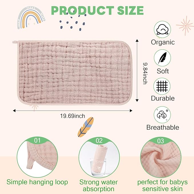 - 6 Absorbent Layer Design: each muslin burp cloths has 6 layers, thick enough to absorb liquids and easily wipe away sweat and water, providing a comfortable use that will keep baby's chin dry and the soft material will guard teething baby's cheeks