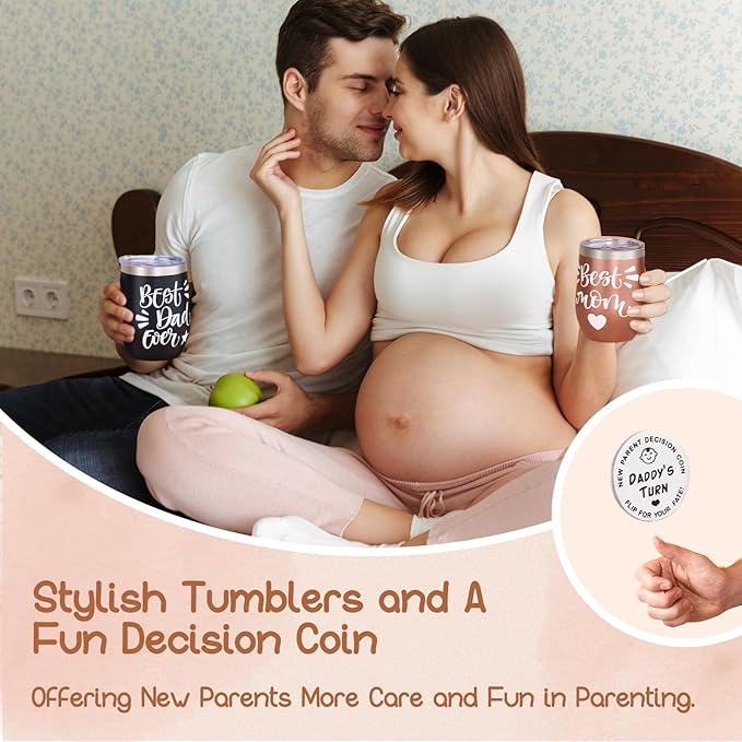 - MATCHING TUMBLERS & DECISION COIN FOR SLEEP-DEPRIVED DREAM TEAM. Premium modern rose gold/black tumbler set for first time parents at baby showers featuring "Best Mom/Dad Ever" prints, food-grade stainless steel keeps drinks hot 3h/cold 9h durable BPA-free leak-proof lids ideal for sleepless nights at-home/on-the-go, a must-have for new parents. Hand wash only. "Hello World" acrylic sign for INS newborn pics. The playful "Mom’s Turn/Dad’s Turn" decision coin decides diaper duty/midnight feeds, adding a fun twist! Playful stress-relieving makes it ideal for first-time parents gift.