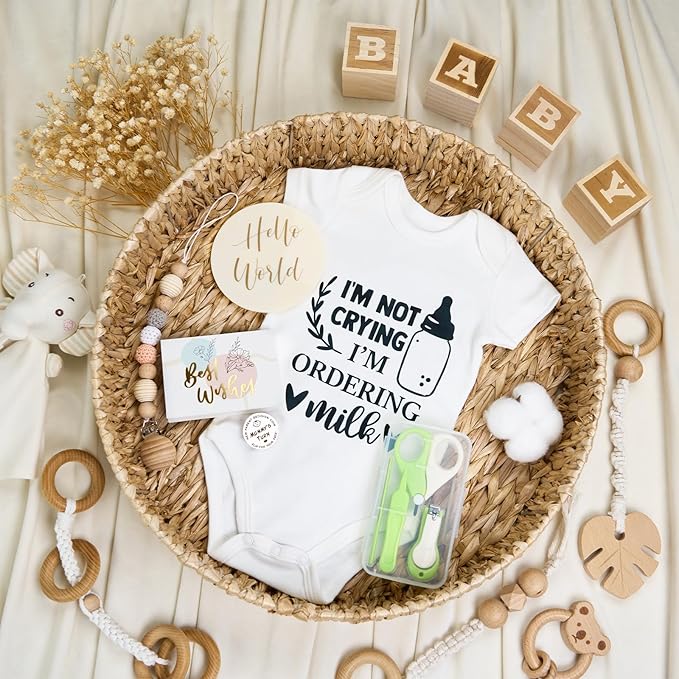 - READY TO GIFT, PREMIUM QUALITY, FUNNY INFANT WELCOME GIFT REGISTRY. Newborn essentials make a unique functional gift sets for new mother and father to be, 0-3M sized onesie set with hat, socks, anti-scratch babe mittens with tight closure, protect baby's delicate skin; the nail care kit helps parents trims tiny fingers and toes safely & effectively, neutral beige/white tones for gender reveal gift for parents-to-be. premium gold-foil gift box & baby bee tissue packaging, completed your best wishes in greeting cards, makes heartfelt baby shower basket to celebrate the little Bebe's arrival!
