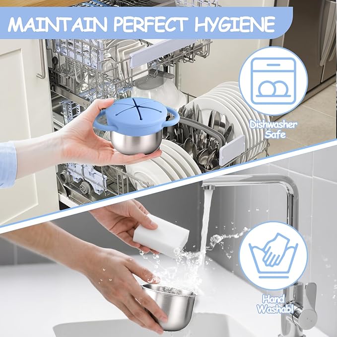 - Easy to Clean & Perfect for On-the-Go Families:Our snack cups are designed for effortless cleaning and hassle-free use.The silicone snack containers with lids are dishwasher-safe, while the stainless steel snack containers for kids can be quickly wiped clean.Pack them with healthy snacks like crackers, berries, or yogurt melts, and watch your little one enjoy mess-free munching anytime, anywhere. A must-have for travel, picnics, or everyday use, these baby snack containers simplify snack time for everyone!