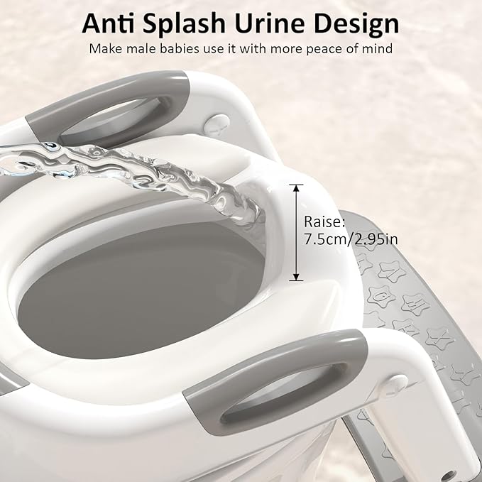 - [HEIGHT ADJUSTABLE] : The potty training seat features 8 adjustable positions(adjustable height range 0-4.3in), ensuring that the baby's little feet do not hang in the air and it is suitable for multi-age different height babies, suitable for different heights of the toilet.Also detachable screws are included,so you can easily raise or lower the toilet ladder, ensuring to be sturdy and give mom peace of mind.