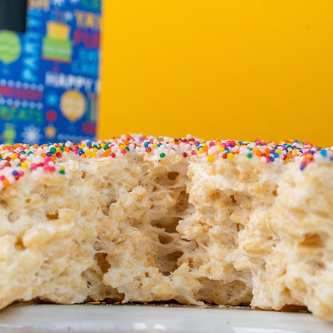 - 🍰 RAINBOW SPRINKLE DOTS CAKE – This colorful mini crispy cake is packed with marshmallowy goodness and topped with rainbow sprinkle dots and a birthday candle — the perfect way to brighten someone’s big day.
