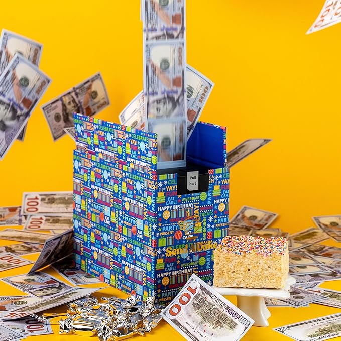 - 💸 MONEY SHOWER SURPRISE – The Birthday Billionaire Box bursts open with flying fake money, kicking off the celebration with an unforgettable surprise.