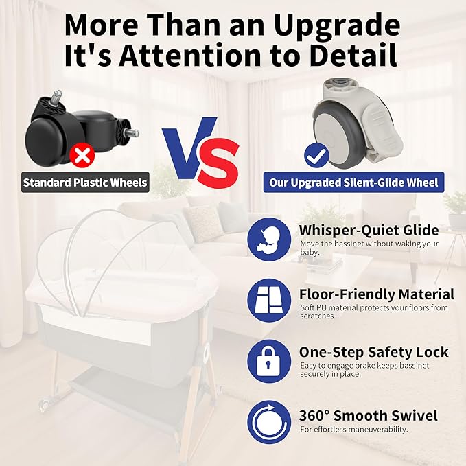- 🤫 ENHANCED STABILITY & ONE-STEP LOCKING—— Experience superior stability and effortless mobility. We've elevated our design with oversized, whisper-quiet wheels that glide smoothly over any floor surface—even carpets. Secure the bassinet in place with a simple toe-tap on the extra-large locking pedal.