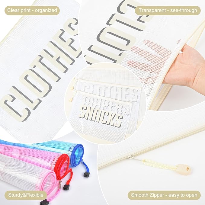 - Durable, Lightweight, and Transparent - Made of sturdy mesh PVC material, these pouches are water-resistant, lightweight, and see-through — making it easy to identify what’s inside without opening them