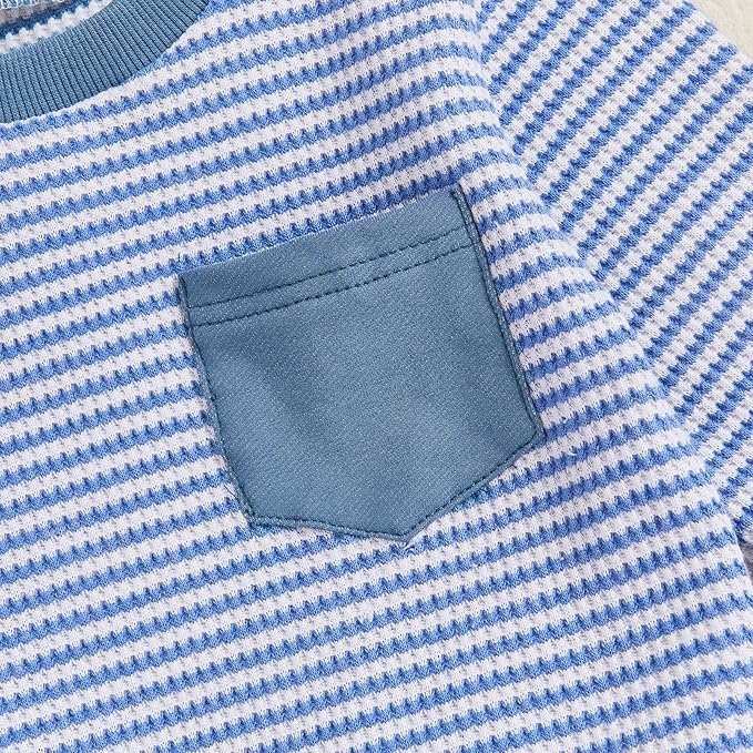 - OCCASIONU: Unisex long sleeve t-shirt top shorts set are matching waffle top, white and striped matching pants have pocket and adjustable elastic waistband.Infant Baby boy outfit, suitable for outings, play, travel, kindergarten, zoos, vacations, summer parties, photography,halloween, family day, and more