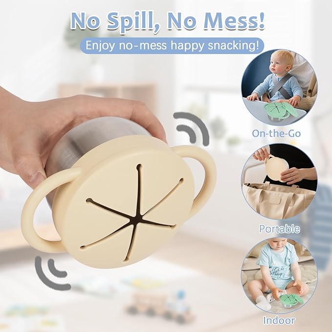 - Spill-Proof Snacking, Anywhere! - The silicone lid locks snacks in, the petal-shaped opening lets toddlers grab bites easily while minimizing mess. The removable travel lid snaps tight for a leakproof seal - perfect for home, car rides, or on-the-go adventures. Less spills, more happy snacking!
